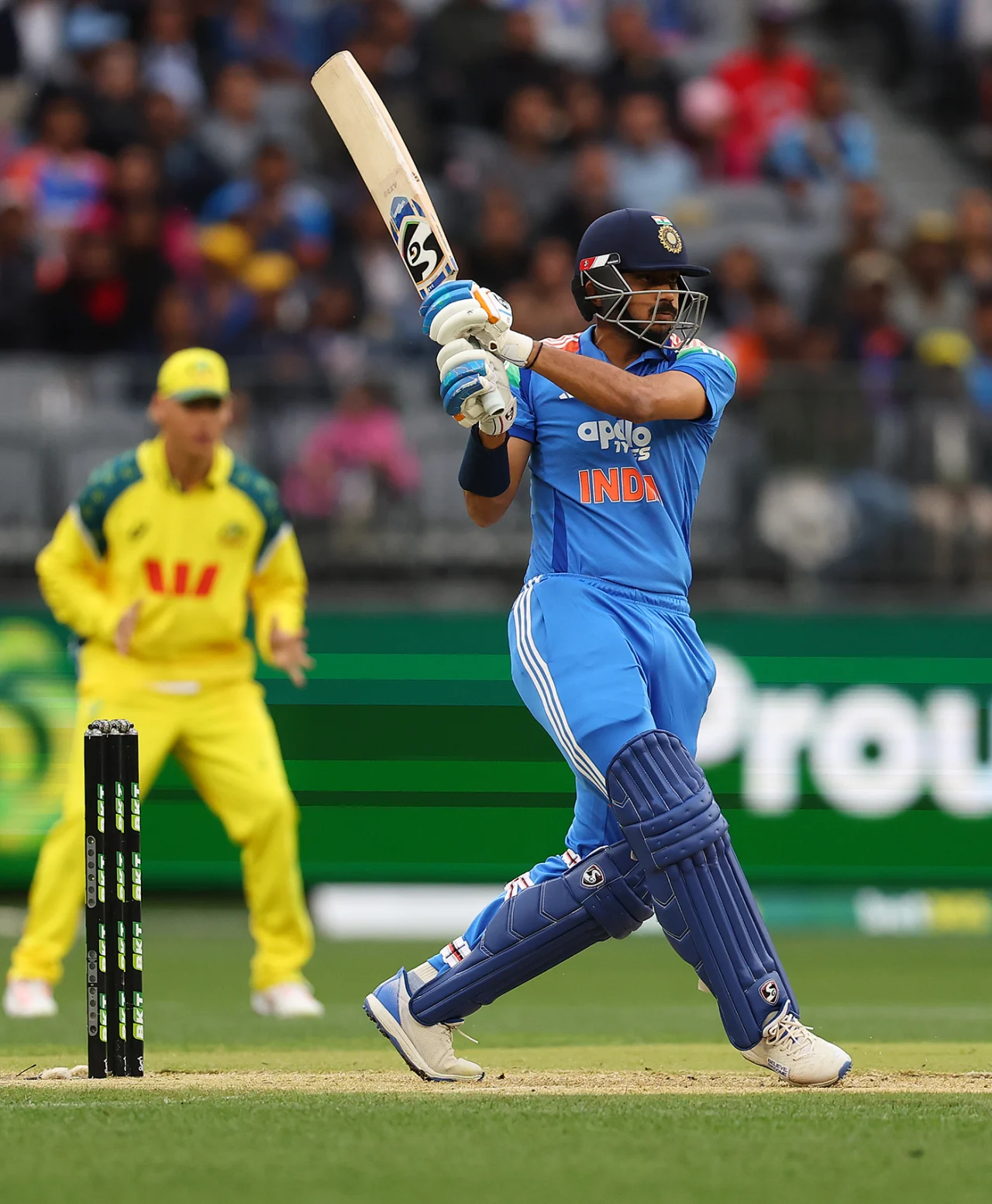 पर्थ. पर्थ के ऑप्टस स्टेडियम में खेले जा रहे पहले वनडे में बारिश के कारण मुकाबला 26-26 ओवर का रखा गया। भारतीय टीम ने 26 ओवर में 9 विकेट खोकर 136 रन बनाए। डकवर्थ-लुईस (DLS) नियम के तहत ऑस्ट्रेलिया को जीत के लिए 131 रन बनाने हैं। केएल राहुल ने सबसे अधिक 38 रन बनाए, जबकि अक्षर पटेल ने 31 रन की महत्वपूर्ण पारी खेली। नीतीश कुमार रेड्डी और वॉशिंगटन सुंदर ने भी टीम को कुछ मजबूत पारियां दी।