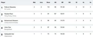 एशिया कप 2025 में टॉप-5 बल्लेबाजों की सूची में श्रीलंका के पथुम निसांका 118 रन बनाकर पहले स्थान पर काबिज हैं। उनके बाद हॉन्गकॉन्ग के निजाकत खान 94 रन के साथ दूसरे नंबर पर हैं। संयुक्त अरब अमीरात (UAE) के मोहम्मद वसीम 88 रन बनाकर तीसरे स्थान पर हैं, जबकि बांग्लादेश के लिटन दास 87 रन के साथ चौथे स्थान पर हैं।
