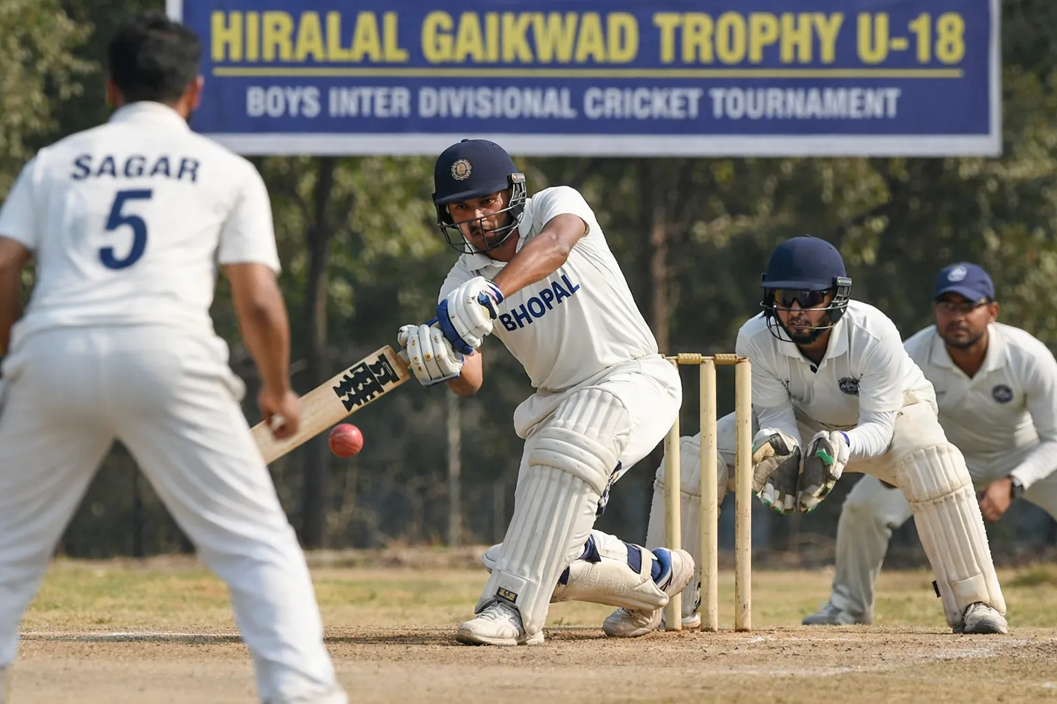 एनएसटी न्यूज, भोपाल: मध्य प्रदेश क्रिकेट एसोसिएशन द्वारा आयोजित हीरालाल गायकवाड़ ट्रॉफी अंडर-18 बॉयज इंटर डिवीजनल मल्टी डे क्रिकेट टूर्नामेंट में भोपाल डिवीजन ने शानदार प्रदर्शन करते हुए सागर डिवीजन को फॉलोऑन खेलने पर मजबूर कर दिया। यह चार दिवसीय मुकाबला भोपाल के फैथ क्रिकेट मैदान पर खेला जा रहा है। मैच के दूसरे दिन भोपाल डिवीजन ने अपनी पहली पारी में कल के स्कोर 6 विकेट पर 282 रन से आगे खेलते हुए 112.3 ओवर में 349 रन बनाकर पारी समाप्त की। टीम की ओर से हर्षित शर्मा ने बेहतरीन बल्लेबाजी करते हुए 94 रनों की अहम पारी खेली। सागर डिवीजन की ओर से यशमीत सिंह और निष्कर्ष सक्सेना ने 3-3 विकेट लिए, जबकि प्रियांश झारिया को 2 सफलता मिली। जवाब में सागर डिवीजन की टीम पहली पारी में 57.3 ओवर में मात्र 83 रन पर सिमट गई। आकर्ष विश्वकर्मा ने सर्वाधिक 31 रन बनाए। भोपाल डिवीजन की घातक गेंदबाजी के सामने सागर की बल्लेबाजी टिक नहीं सकी। ओजस शुक्ला ने शानदार प्रदर्शन करते हुए 6 विकेट झटके, जबकि दिव्यांश बंडोलिया ने 2 विकेट अपने नाम किए। इस तरह भोपाल डिवीजन ने पहली पारी में 266 रनों की बड़ी बढ़त हासिल कर ली और सागर डिवीजन को फॉलोऑन खेलने पर मजबूर किया। दूसरी पारी में सागर डिवीजन ने दिन का खेल समाप्त होने तक 10.3 ओवर में 3 विकेट खोकर 19 रन बना लिए हैं।
