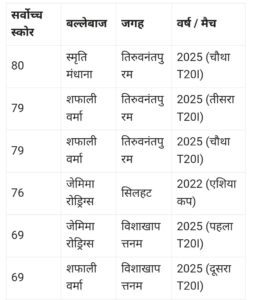 इस दौरान शेफाली वर्मा ने 46 गेंदों में 79 रन, जबकि स्मृति मंधाना ने 48 गेंदों में 80 रनों की शानदार पारी खेली। इस मैच में मंधाना ने कई बड़ी उपलब्धियां भी हासिल कीं। वह भारत के लिए महिला टी20 अंतरराष्ट्रीय में सर्वाधिक छक्के लगाने वाली बल्लेबाज बन गईं और अब उनके नाम 80 छक्के दर्ज हैं। इस मामले में उन्होंने कप्तान हरमनप्रीत कौर (78 छक्के) को पीछे छोड़ दिया। इसके साथ ही श्रीलंका के खिलाफ टी20 अंतरराष्ट्रीय में सबसे बड़ी पारी खेलने के मामले में भी मंधाना, शेफाली से आगे निकल गईं। वहीं, स्मृति मंधाना ने अंतरराष्ट्रीय क्रिकेट में अपने 10 हजार रन भी पूरे कर लिए।