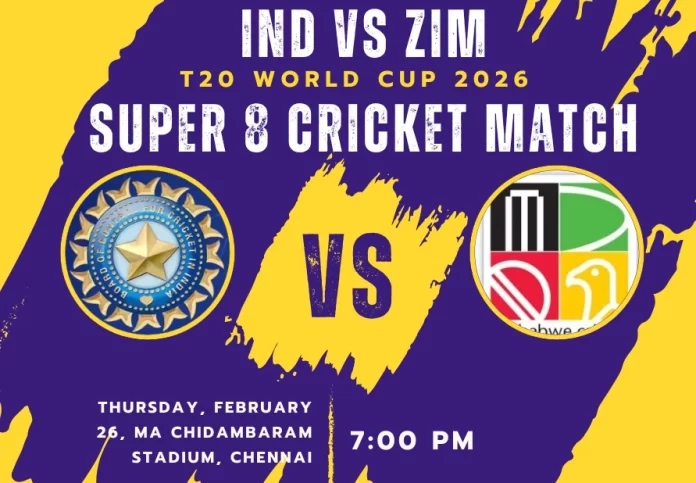 T20 वर्ल्ड कप 2026 के सुपर-8 चरण में भारत बनाम जिम्बाब्वे के बीच मैच गुरुवार 26 फरवरी को चेन्नई के एमए चिदंबरम स्टेडियम में खेला जाएगा। - T20 वर्ल्ड कप 2026 के सुपर-8 चरण में भारत बनाम जिम्बाब्वे मैच किस समय शुरू होगा?