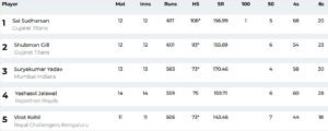 ऑरेंज कैप रेस की बात करें तो मुंबई इंडियंस के स्टार बल्लेबाज सूर्यकुमार यादव ने 43 गेंद पर 73 रन की पारी खेली और यशस्वी जायसवाल से आगे निकल गए। ऑरेंज कैप पर फिलहाल साई सुदर्शन का कब्जा है। शुभमन गिल दूसरे नंबर पर हैं। दोनों के 600 से ज्यादा रन हैं। विराट कोहली 5वें नंबर पर हैं। केएल राहुल ने 11 रन की पारी खेली, लेकिन वह इस सीजन 500 से ज्यादा रन बनाने वाले बल्लेबाजों की सूची में शामिल हो गए।