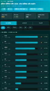 दिल्ली कैपिटल्स पांचवें नंबर पर है। लखनऊ सुपर जायंट्स के खिलाफ मैच में इम्पैक्ट प्लेयर के तौर पर खेले विराट कोहली ने 49 रनों की पारी खेली। उन्होंने ऑरेंज कैप पर कब्जा जाम लिया। सनराइजर्स हैदराबाद के हेनरिक क्लासेन उनसे 4 रन से पीछे हैं। गुजरात टाइटंस के प्रसिद्ध कृष्णा के पास पर्पल कैप है। उन्होंने 10 विकेट लिए। अंशुल कम्बोज के भी 10 विकेट हैं, लेकिन प्रसिद्ध के आंकड़े बेहतर हैं।