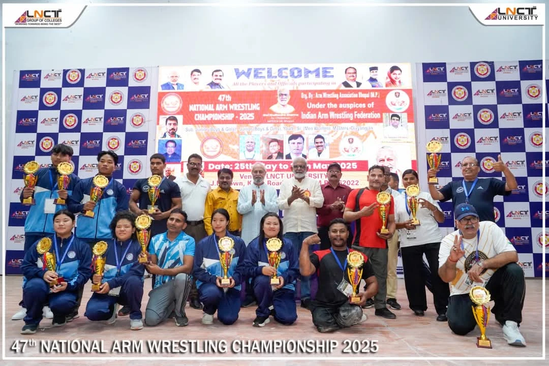 भोपाल। एलएनसीटी विश्वविद्यालय, भोपाल में तीन दिवसीय 47वीं राष्ट्रीय आर्म रेसलिंग चैंपियनशिप का भव्य समापन हुआ। यह प्रतियोगिता भारतीय आर्म रेसलिंग फेडरेशन के मार्गदर्शन में आर्म रेसलिंग एसोसिएशन भोपाल (म.प्र.) द्वारा आयोजित की गई। इस प्रतिष्ठित प्रतियोगिता में देश के 12 राज्यों से 300 से अधिक प्रतिभागियों ने भाग लिया। प्रतिभागियों ने सब-जूनियर, जूनियर, यूथ, सीनियर (पुरुष एवं महिला), मास्टर्स तथा दिव्यांगजन वर्गों में अपने कौशल और शक्ति का प्रदर्शन किया। ओवरऑल टीम चैंपियन (पुरुष वर्ग) का खिताब 307 अंकों के साथ उत्तर प्रदेश ने जीता, जबकि अरुणाचल प्रदेश ने 234 अंकों के साथ द्वितीय स्थान प्राप्त किया। महिला वर्ग में अरुणाचल प्रदेश ने 183 अंकों के साथ ओवरऑल टीम चैंपियन मे प्रथम तथा उत्तर प्रदेश 153 अंकों के साथ द्वितीय स्थान पर रहा।