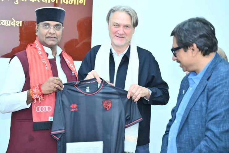 भोपाल : सहकारिता, खेल एवं युवा कल्याण मंत्री विश्वास कैलाश सारंग ने मंगलवार को मंत्रालय में जर्मनी के प्रतिष्ठित फुटबॉल क्लब FC Ingolstadt 04 के सीइओ एवं प्रसिद्ध कोच डाइटमार बीयर्सडॉर्फ से भेंट की। मंत्री श्री सारंग ने कोच बीयर्सडॉर्फ का आभार व्यक्त करते हुए कहा कि उनके द्वारा विचारपुर (मिनी ब्राजील) के प्रतिभावान खिलाड़ियों से प्रत्यक्ष संवाद, आधुनिक प्रशिक्षण विधियाँ और अंतर्राष्ट्रीय फुटबॉल शैली से परिचित कराना, युवा खिलाड़ियों के लिए एक अमूल्य अवसर है। उन्होंने कहा कि प्रधानमंत्री नरेन्द्र मोदी के मार्गदर्शन एवं मुख्यमंत्री डॉ. मोहन यादव के नेतृत्व में मध्यप्रदेश सरकार खिलाड़ियों को वैश्विक स्तर पर तैयार करने के लिए हर सम्भव प्रयास कर रही है। यह मुलाकात न केवल खेल क्षेत्र में अंतर्राष्ट्रीय सहयोग को नई दिशा देने वाली रही बल्कि प्रदेश के उभरते खिलाड़ियों के उत्साह को भी गति प्रदान करने वाली साबित हुई।