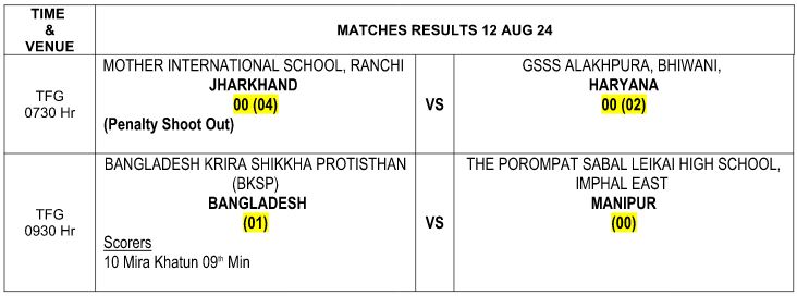 बांग्लादेश क्रीरा शिक्षा प्रोतिष्ठान – 1 (मीरा खातून 9′) ने द पोरोमपत सबल लीकाई हाई स्कूल, इंफाल ईस्ट, मणिपुर – 0 को हराया