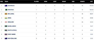 श्रीलंका की टीम 2 में से एक मैच जीती है और एक ड्रॉ रहा है इस कारण तीसरे स्थान पर है। इस लिस्ट में इंग्लैंड पांचवें और बांग्लादेश छठे स्थान पर है। जबकि वर्ल्ड चैंपियन साउथ अफ्रीका की टीम अपना पहला मैच हारकर अंक तालिका में 7वें स्थान पर है। वेस्टइंडीज की टीम पांच में से सभी मैच हारकर आठवें स्थान पर बनी हुई है। न्यूजीलैंड की टीम को अभी इस साइकिल में अपना अभियान शुरू करना है।