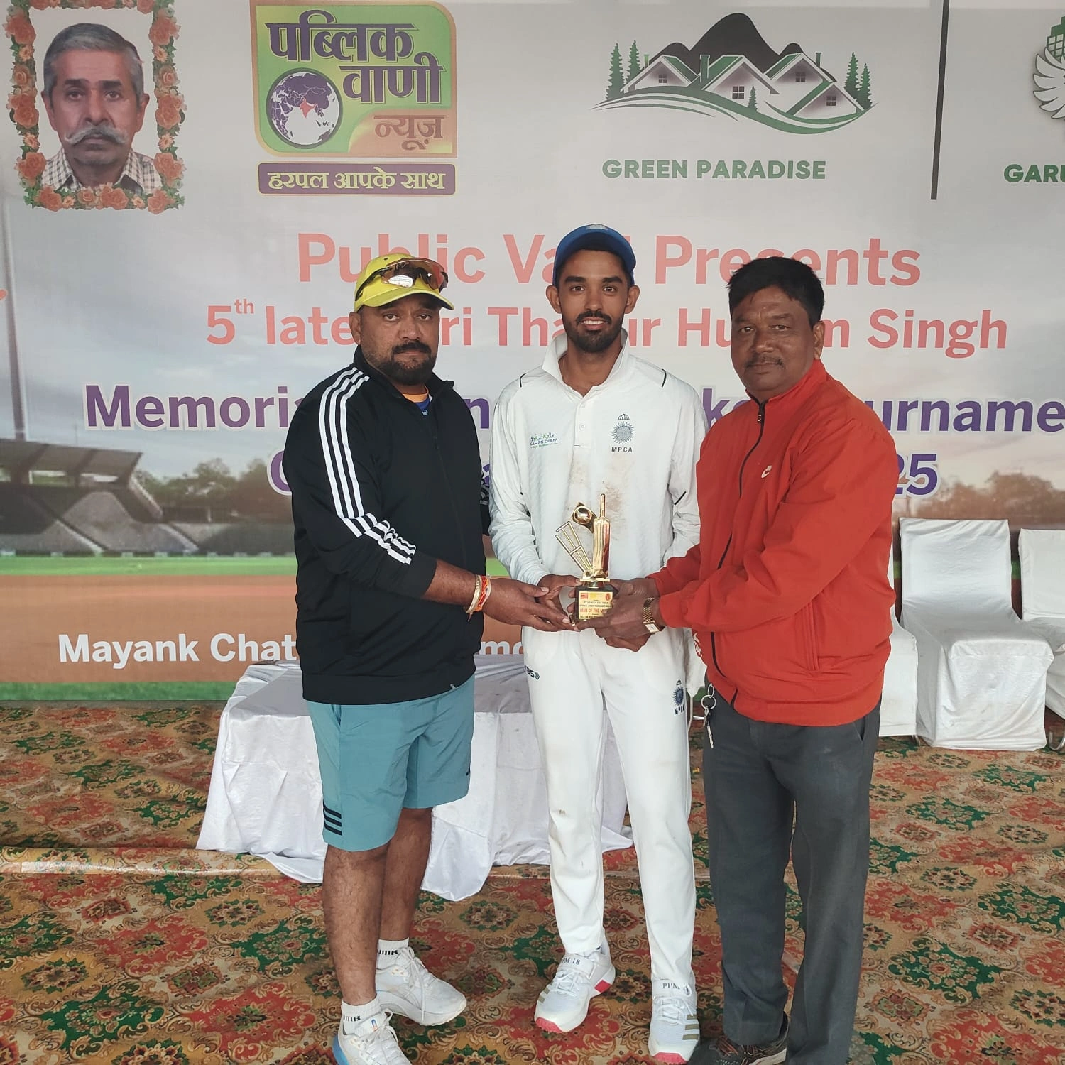 NST News, Bhopal.भोपाल संभाग क्रिकेट संघ और पब्लिक वाणी द्वारा आयोजित ठाकुर हुकुम सिंह स्मृति अखिल भारतीय ग्रीन पैराडाइस कप क्रिकेट प्रतियोगिता के तहत ओल्ड कैम्पियन मैदान पर भोपाल लेपर्ड्स और बीडीसीए प्रेसिडेंट एकादश के बीच मुकाबला खेला गया। मैच रोमांच और शानदार व्यक्तिगत प्रदर्शनों से भरपूर रहा। इसमें बीडीसीए प्रेसिडेंट एकादश 45 रन से जीता। बीडीसीए प्रेसिडेंट एकादश ने पहले बल्लेबाजी करते हुए 348/8 रन का बड़ा स्कोर खड़ा किया। टीम के कप्तान प्रारब्ध मिश्रा ने 100 रन की आतिशी पारी खेलकर नेतृत्व किया, जबकि विकास शर्मा ने 124 रन बनाए। तनिष्क यादव ने 59 और आदित्य तोमर ने 26 रन का योगदान दिया।